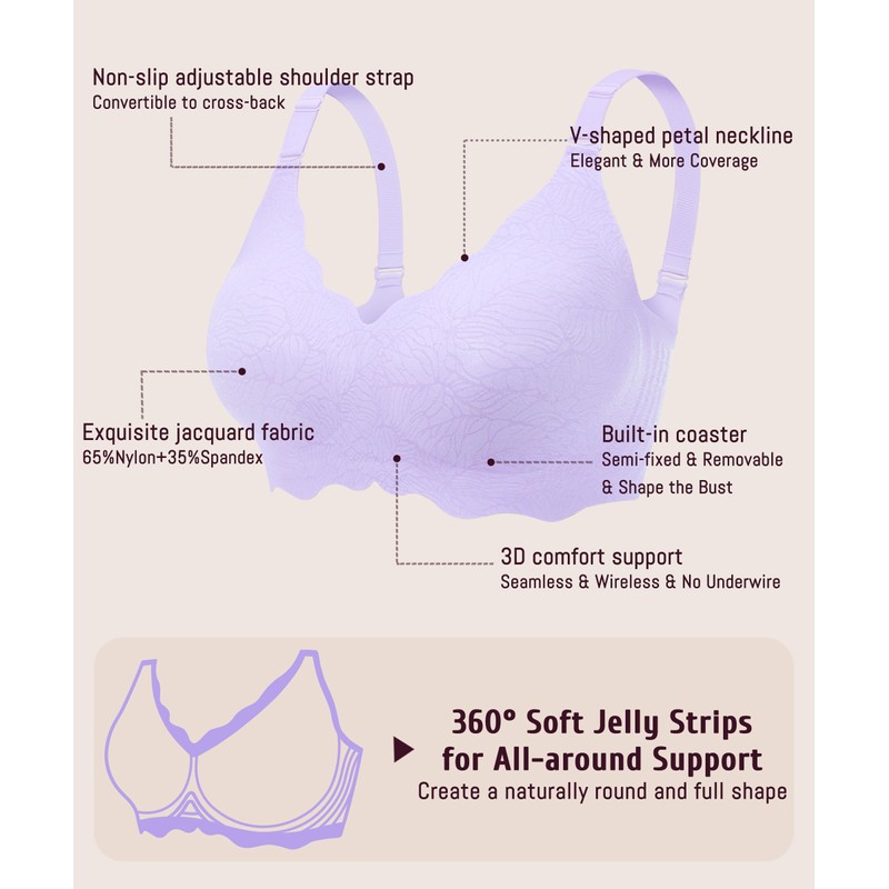 - 【Comfortable Full Coverage Bra】This wireless bra fabric is made of 65% nylon and 35% spandex, the upgrades and changes in the fabric are functionally to allow for better stretch and greater size inclusivity, and the added jacquard pattern on the exterior makes this scalloped bra more sophisticated. This wirefree bra is breathable, lightweight, soft and smooth that allows you to wear the bra as if you don't feel a thing, no pressure or stuffiness, just ultimate comfort and cool dryness.