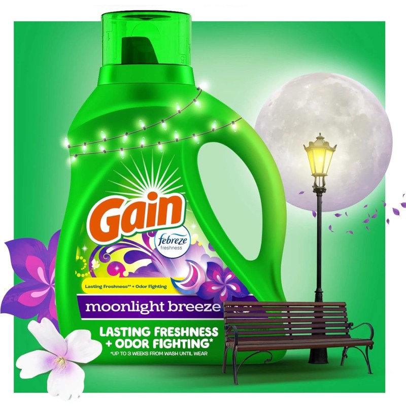 The light, delightful scent of Gain Moonlight Breeze Liquid Laundry Detergent will make your nose feel like it’s in paradise. Equipped with the cleaning power of Oxi Boost and the odor-removal properties of Febreze, Gain Laundry Detergent Liquid provides you with excellent results wash after wash with just this detergent! This laundry soap gets rid of set-in odors and two-week-old stains with the power of Oxi Boost, composed of highly effective pretreaters, surfactants, and enzymes. This laundry detergent is also safe for use with regular washers and high-efficiency washers—even in cold water! Take your nose on a moonlit summer stroll via liquid laundry detergent in your laundry. Evoking memories of a sultry summer evening, the rich, luxurious scent of Gain Moonlight Breeze Laundry Detergent Liquid is so seductive, you won’t be able to keep your nose off your clothes. Packing 50% more scent compared to regular Gain powder detergent, you can now revel in the amazing scent of Gain Liquid Laundry Detergent for up to six weeks from wash.