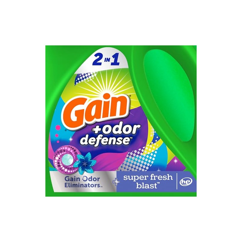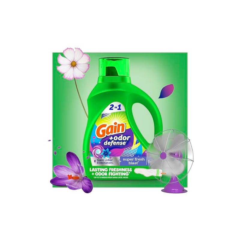 Experience the power of Gain Odor Defense Super Fresh Blast Laundry Detergent Liquid, your ultimate laundry solution. This liquid laundry detergent is designed to lift away dirt while locking in an amazing scent that lasts up to six weeks from wash until wear. Bye-bye, stink! Gain Odor Defense Liquid Laundry Detergent lifts away tough in-wear odors at the source, instead of just masking them. Do your nose a favor and give this scent a goooood sniff! Crisp and strikingly effervescent, let your senses twirl through fields of fresh flowers and fruit, celebrating the amazing gift that is Super Fresh Blast. Now, go on sniff like no one's watching. With its great cleaning power, this laundry soap not only smells fantastic but also cleans exceptionally well, providing you with excellent results wash after wash. Whether you're using regular or high-efficiency washers, this laundry detergent liquid delivers excellent results even in cold water. Simply measure out your desired level and pour into the compartment or drum. Take your laundry experience to the next level when you dive nose first into the world of Gain! Gain is the only laundry brand that can give you the same scent throughout the entire wash process! Whether you're sniffing around for a detergent, a fabric softener, scent boosters, or dryer sheets, we have the scents you'll swoon over, especially when you use the same scent from start to finish!
