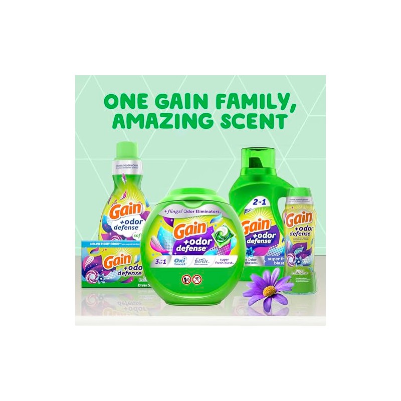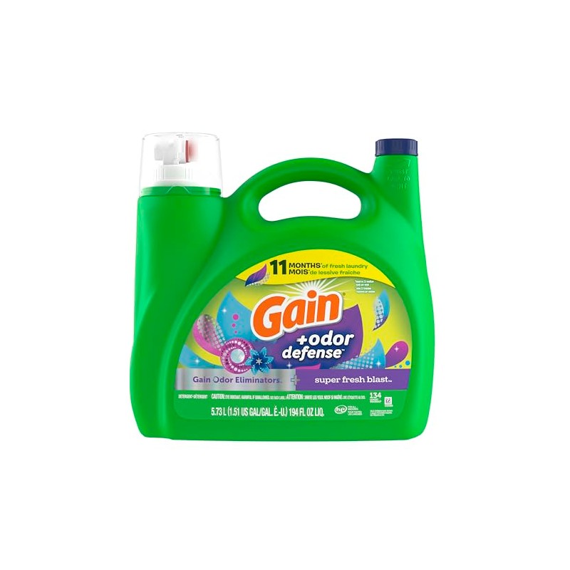 - Includes 194 fl oz of Gain Odor Defense Liquid Laundry Detergent, Super Fresh Blast Scent, enough for 134 loads