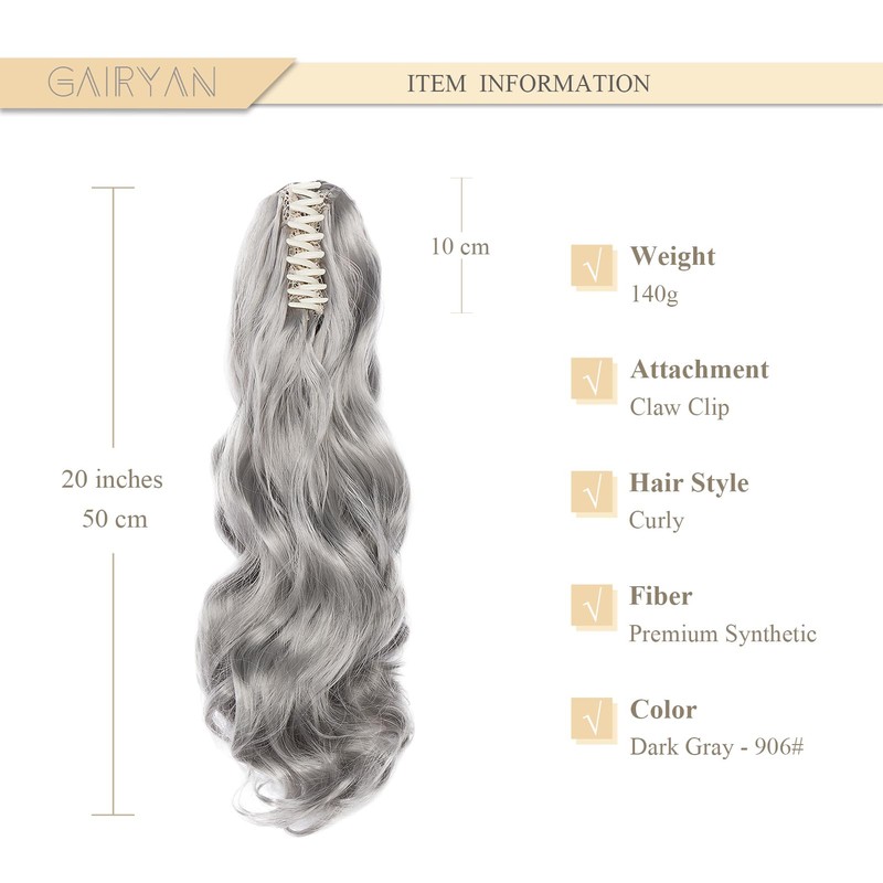 Gairyan 20inch Ponytail Extension Clip in Ponytail Hair Extensions Curly Wavy Pony Tails Claw on Ponytail Long Wave Synthetic Hairpieces for Women Soft Real Look (Dark Gray)
