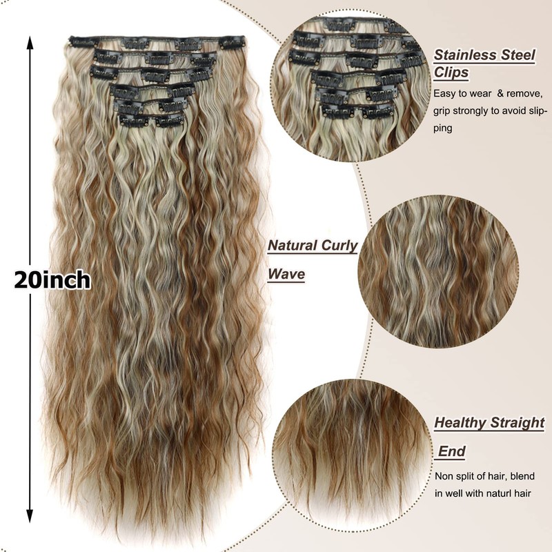 Gairyan Clip-In Extensions Like Real Hair, 6-Piece Set, 50 cm, Synthetic Wavy Long Curly, Light Brown & Blonde