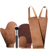 - ✔5-in-1 Tanning Glove Set: The self tanning mitt set covers all the applicators you need to apply your tanning lotion. Our fake tan mitt set includes 1x exfoliating glove, 1x fake tan mitt, 1x mini face tan mitt glove, and 1x back applicator, and 1x tanning brush so whether it's applying details or your back, you can do it all yourself for a true self-tan.