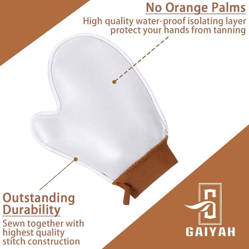 - 【EVERY DETAIL SHOWS ITS HIGH QUALITY】 The premium velvet mitt is both soft and luxurious to the touch, helping your tanning lotion glide onto the skin beautifully, which ensures an even result, no streaks or misses! High quality water-proof isolating layer, which protect your hands from tanning, no orange palms. GAIYAH self tanner applicator mitt is carefully sewn together with highest quality stitch construction. This creates a mitt which will outlast any on the market in durability and use.