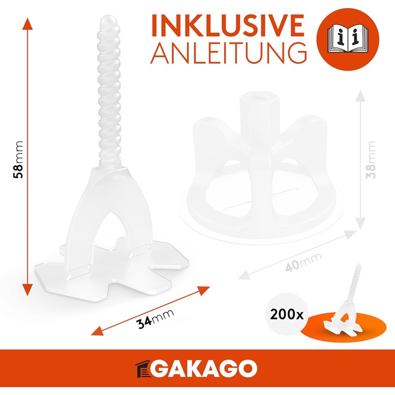Gakago Tile Levelling System 200 Thread Tabs 2 mm - Laying Aid for a Perfect Joint Pattern - Superior Range for Tile Thicknesses 3-18 mm - Tile Protection with Schon Washers