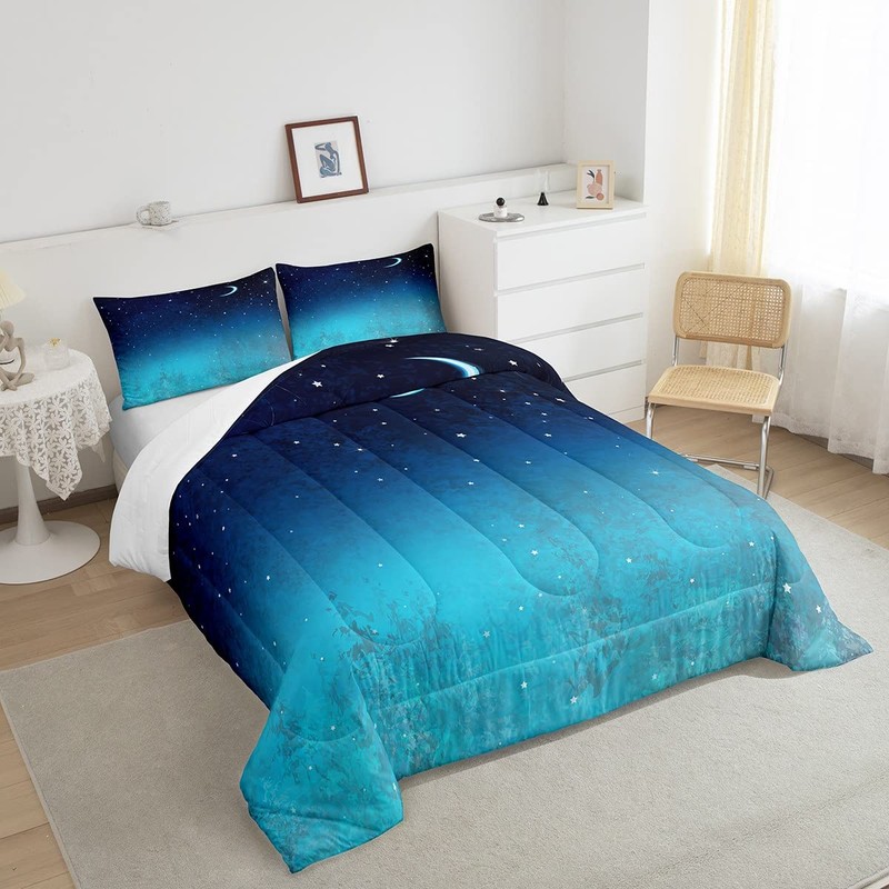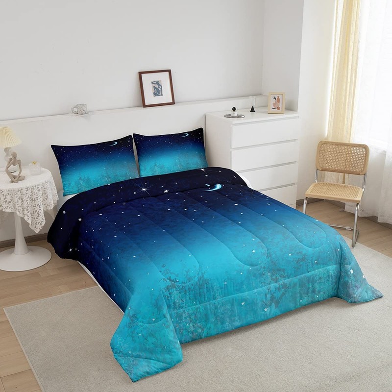 - Unique Design: A starry night comforter set, with galaxy moon and star printted aesthetic bedding set, which can add a twinkling of starry sky touch to your home decor. And this constellation nebulas pattern quilted duvet set is suitable for young man or teen children bedroom,your girls or boys will love this night sky theme bedding collection.