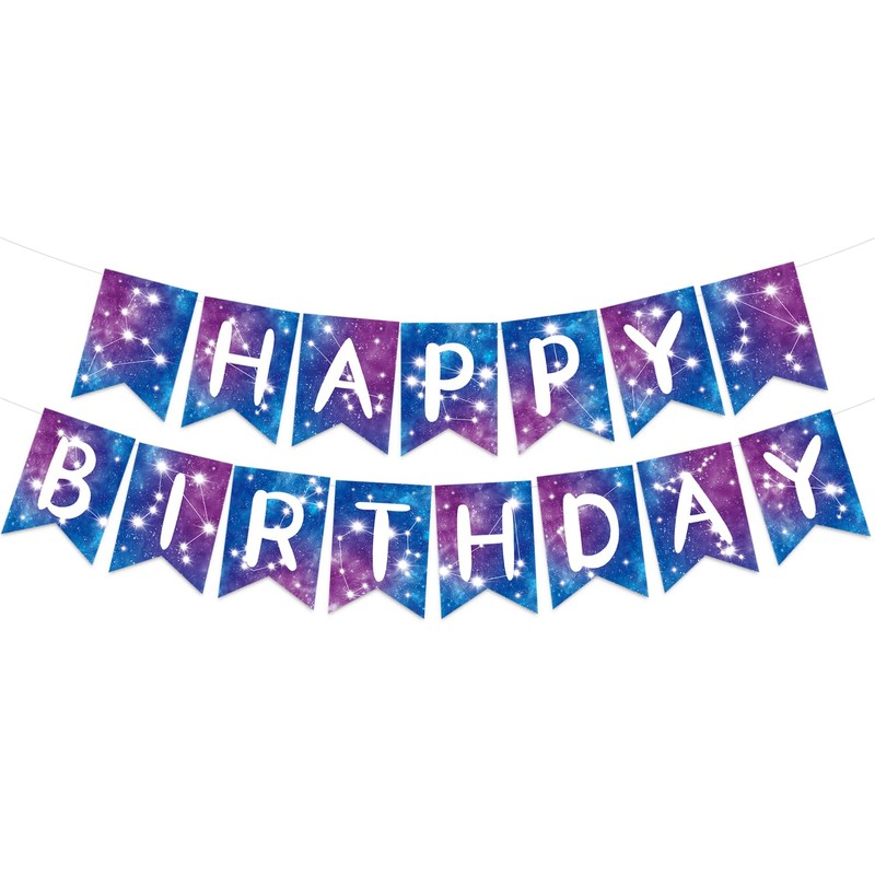 - Galaxy Birthday Banner : Our Galaxy Themed Party Banner Garland, the perfect addition to any birthday celebration! You will receive 2 pieces of Galaxy party banners with different travel theme motifs, enough to help you complete an unforgettable adventure party, the travel party garland can also be used as background props for photo shoots.