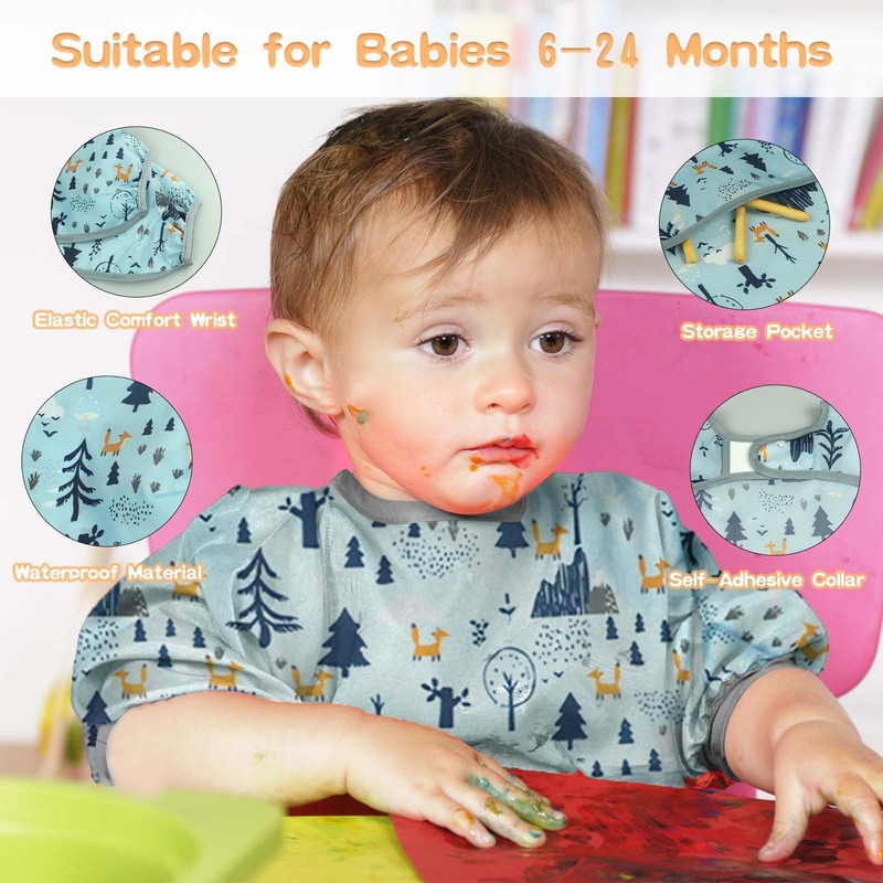 - Suitable size: washable full body bib sleeve bib waterproof fits babies aged 6 to 24 months with a self-adhesive collar and is therefore a must for baby's feeding time.