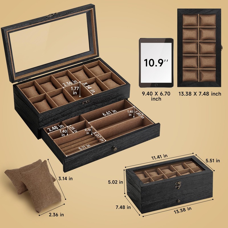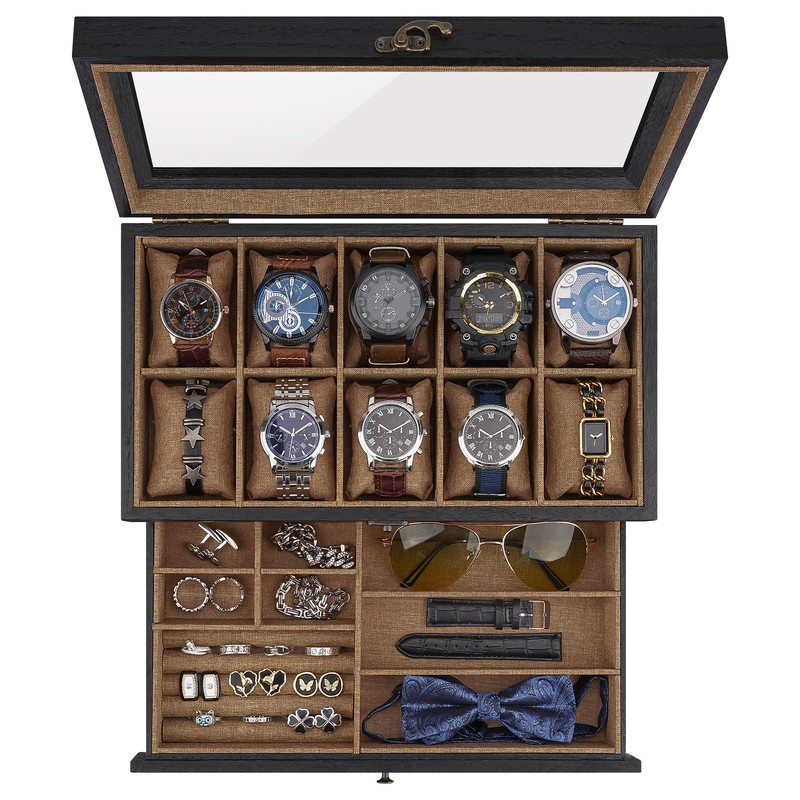GALHUBIS Watch Box with 10 Slots, 2-Tier Watch Case for Large Dial Watches, Watch Display Case with Lid, Removable Watch Pillows, Gifts for Men Women, Watch Organizer with Drawer, Jewelry Box, Black