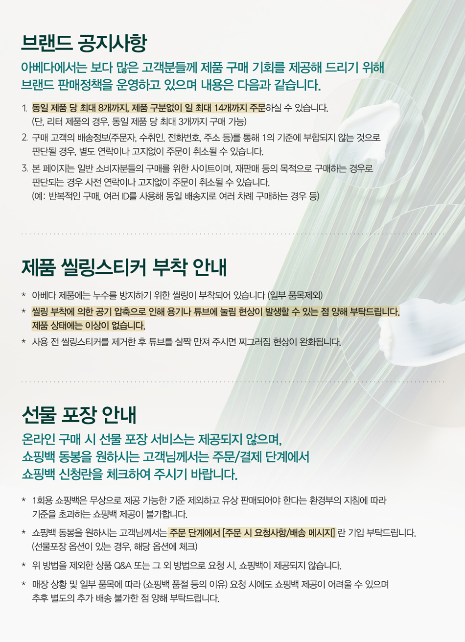 상품관련 상세문의처 : 갤러리아백화점(한화갤러리아㈜ 명품관) 아베다 T.02-3446-6930