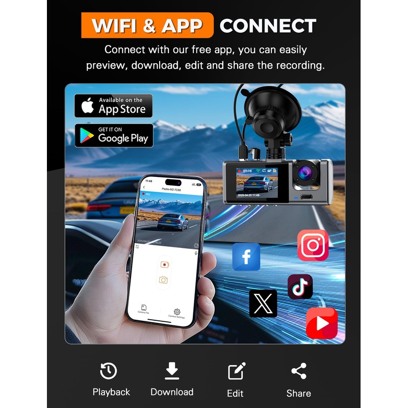 - 【Dash Camera for Cars with WiFi App Control】 Connect to the free app with no subscription required. Adjust settings, view live streams, and playback footage directly from your smartphone. Effortlessly download, share videos and photos on social media or messaging apps, allowing you to instantly share your journey with family, friends, and followers.