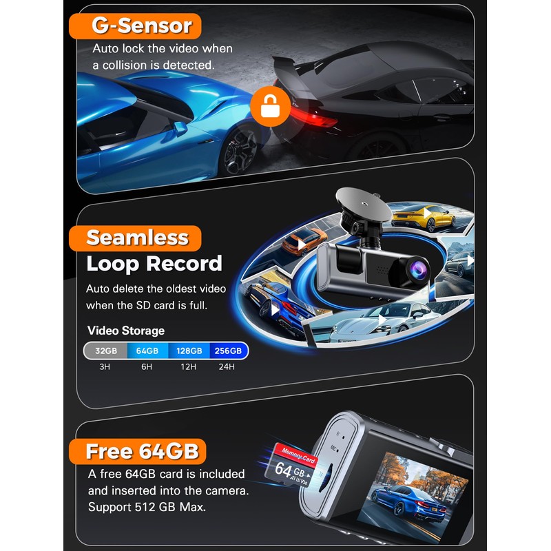 - 【64GB SD Card Included & Extra Charging Port】Start using the M5 dash cam right away with the included 64GB SD card; no need to purchase one separately. The car charger also features an extra USB port, allowing you to charge your phone or other devices while the camera records, ensuring you don’t lose your car’s charging source.