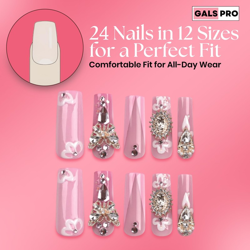 GALSPRO Long Press on Nails - Set of 24 Fake Nails with Designs in 12 Different Sizes for Perfect Fit, Cute False Nails Kit for Women with 0.07oz Nail Glue, A Double Sided Nail File & Cuticle Stick