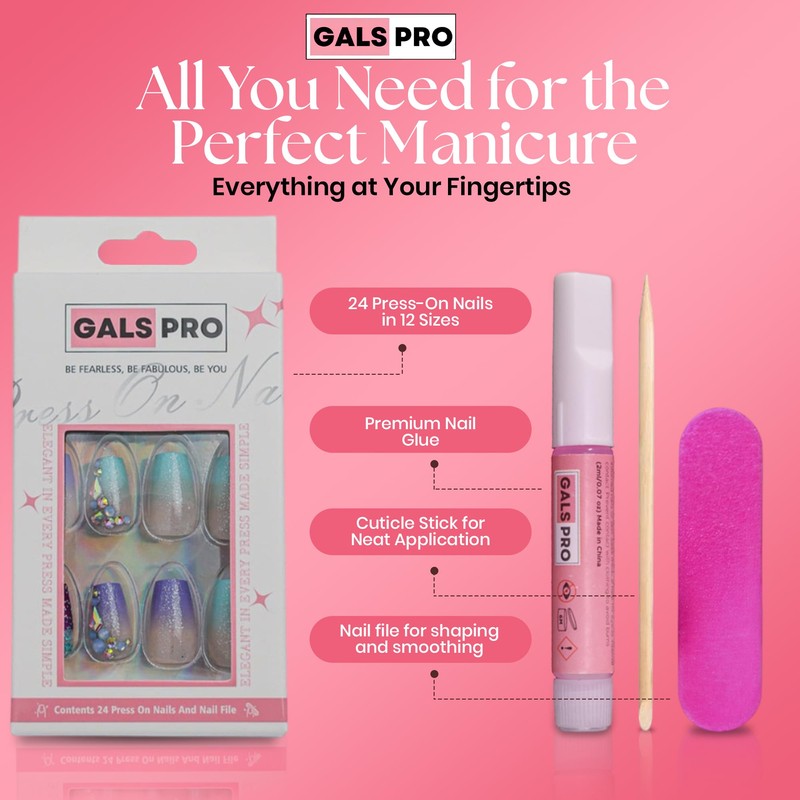 - Easy to Apply - Our press-on nails for women are designed for ease and durability. The set includes everything you need, 24 nails in 12 different sizes, nail glue, a double-sided file, and a cuticle stick.