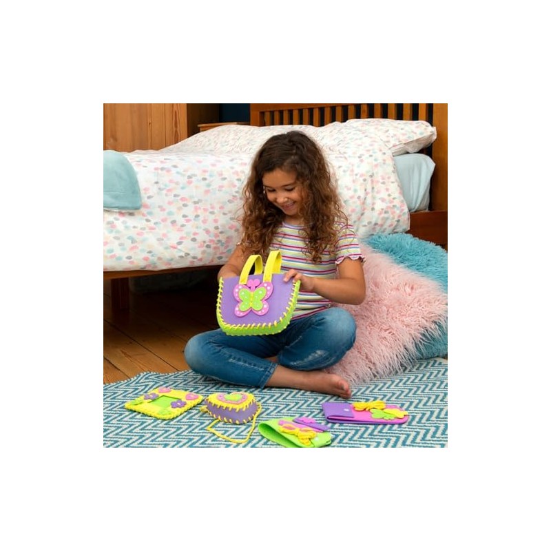 Make a butterfly bag, Neck purse, picture frame, notepad cover and pencil case. Stitch the pre-punched sections together with the cord and decorate with foam shapes and stick-on gems. Contents: 5 sewing kits of pre-cut foam pieces and cord, plastic bodkins, stick-on gems, notepad, 2 pencils, guide.