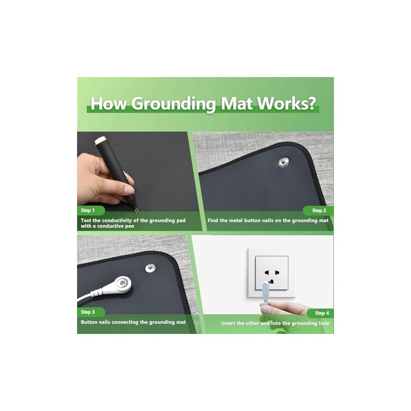 - Effortless Grounding in 3 Steps: 1. Unroll the grounding mat earthing (smooth conductive side up) 2. Plug cord into grounded outlet 3.Touch the mat barefoot/hand. Instant static-neutralizing