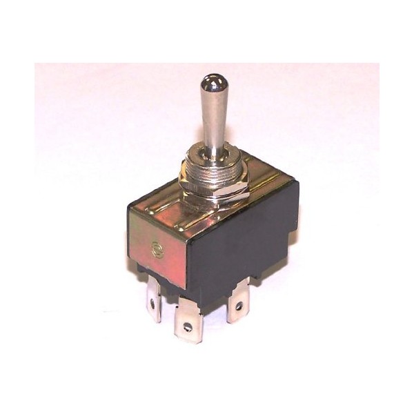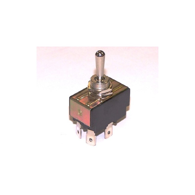 30 amp, Momentary On-Off-Momentary On Toggle Switch. It comes with built-In jumper bars for polarity reversing. Simply connect power and ground and two DC motor leads and the switch will reverse the motor direction. This heavy duty switch mounts in a 7/16 diameter hole and it has 1/4 quick connect terminals.