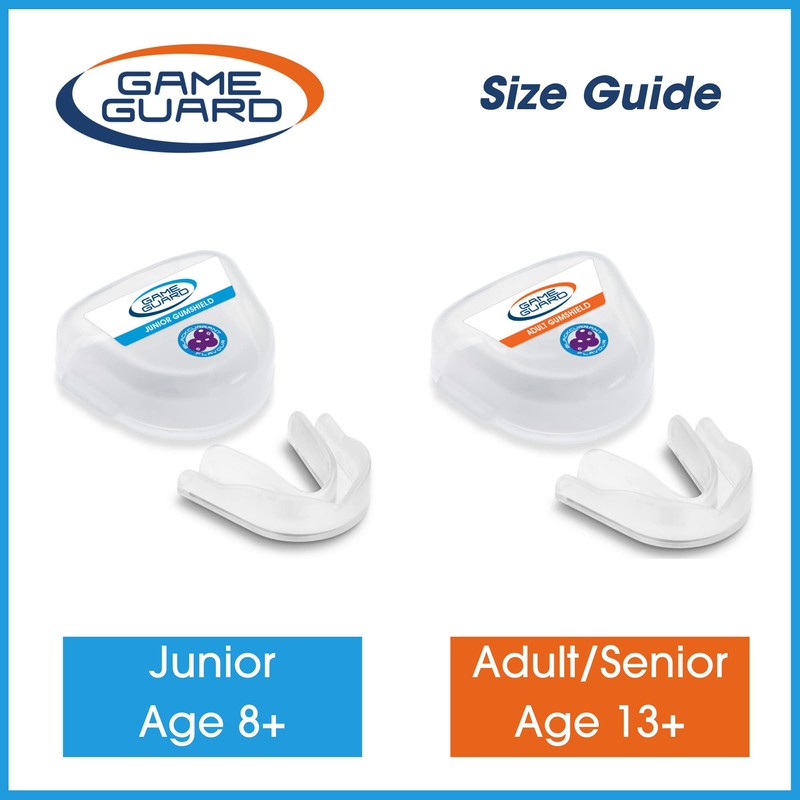 - ✅ Available in single colour Clear, Black, Blue, Baby Blue, Baby Pink, Red, Green, Yellow, White, Gold, Silver, Green, Pink Sparkle, Blue Glitter. Game Guard Gumshields suit men, women, boys, and girls. Sizes - As a guide Senior Size - Suitable for Age 13+. Junior suitable for 8+ . The gum shield can be trimmed if necessary. If the guard does not fit first time or needs to be adjusted, just mould it again. The instructions are attached to the rear of the case.