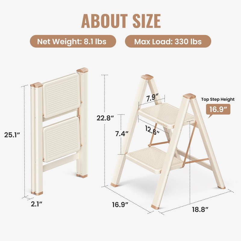 - Stable & Sturdy Construction: Made of thickened carbon steel frame, this 2 step ladder is sturdy. The side crossbars of this step stool for adults enhance basic support and it bears up to 330lbs