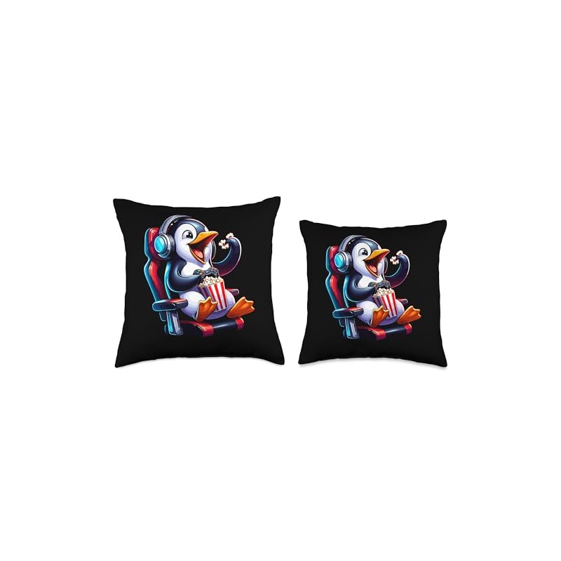 Gamer Penguin Popcorn Gaming Chair Headphones Games Player Throw Pillow