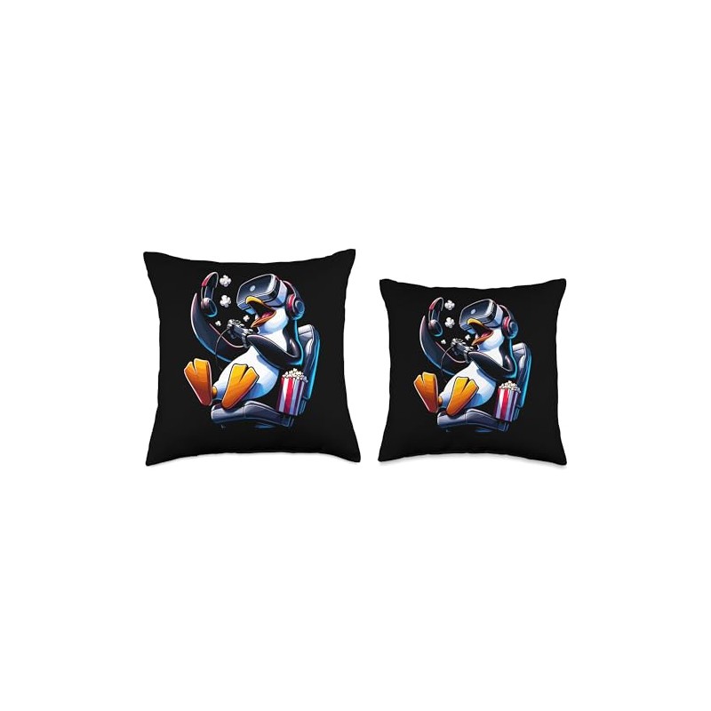 Gamer Penguin Popcorn Gaming Chair Headphones Games Player Throw Pillow