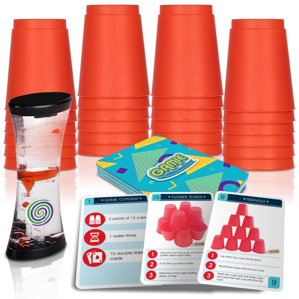 Gamie Stacking Cups Game for Kids, Set Includes 24 Cups, 18 Fun Challenging Cards, and Water Timer, Family Games, Indoor Recess Game for Classroom, Great Gift Idea for Boys and Girls Ages 3+