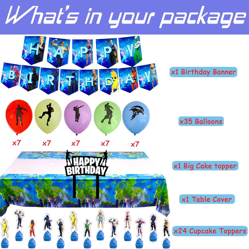 • 🎮 THE MUST HAVE BUNDLE : 62 Pack essentials include : 35 latex balloons , 24 Toppers with 1 Big Gaming Birthday topper, 1 Happy birthday banner, 1 Tablecloth