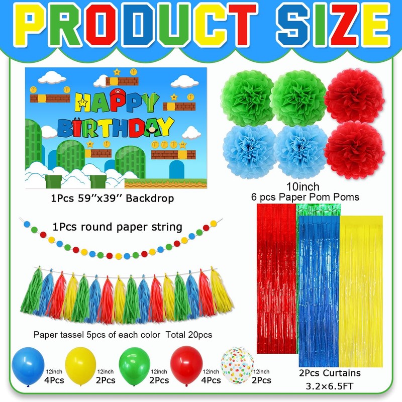 - Super Brother Birthday Decorations: Birthday decoration includes video game themed backdrop banner, 14pcs colorful latex balloons, 16pcs tissue paper tassels, 4pcs foil tassel curtains and 6pcs decorative paper pompoms for a full gaming party experience
