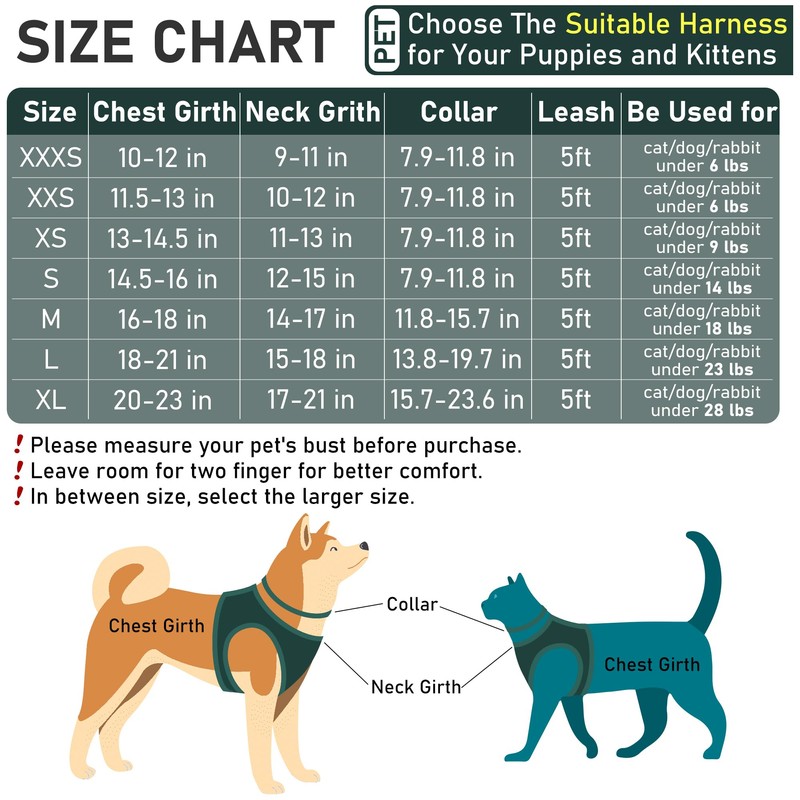 - SIZE CHART - [XXS: Chest Grith 11.5"-13", Neck Grith 10’’-12’’ , Collar Length 7.9"-11.8"]; [XS: Chest Grith 13"-14.5", Neck Grith 11’’-13’’ , Collar Length 7.9"-11.8"]; [S: Chest Grith 14.5"-16", Neck Grith 12’’-15’’ , Collar Length 7.9"-11.8"]; [M: Chest Grith 16"-18", Neck Grith 14’’-17’’, Collar Length 11.8"-15.7"]; [L: Chest Grith 18"-21", Neck Grith 15’’-18’’, Collar Length 13.8"-19.7"]; [XL: Chest Grith 20"-23", Neck Grith 17’’-21’’, Collar Length 15.7"-23.6"]. Please always measure your dog and refer to our brand size chart!