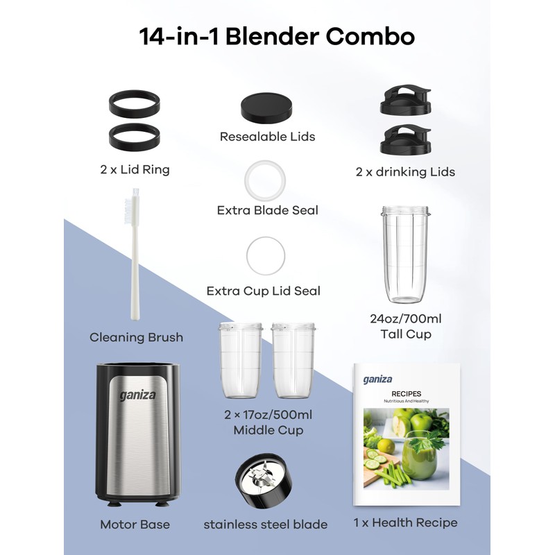 Ganiza Blender for Smoothies, 14Pcs Personal Blender for Shake and Smoothies for Kitchen with 3 Portable Cups (1x24oz & 2X17oz), Single Serve Smoothie Maker, Nutritious Recipe