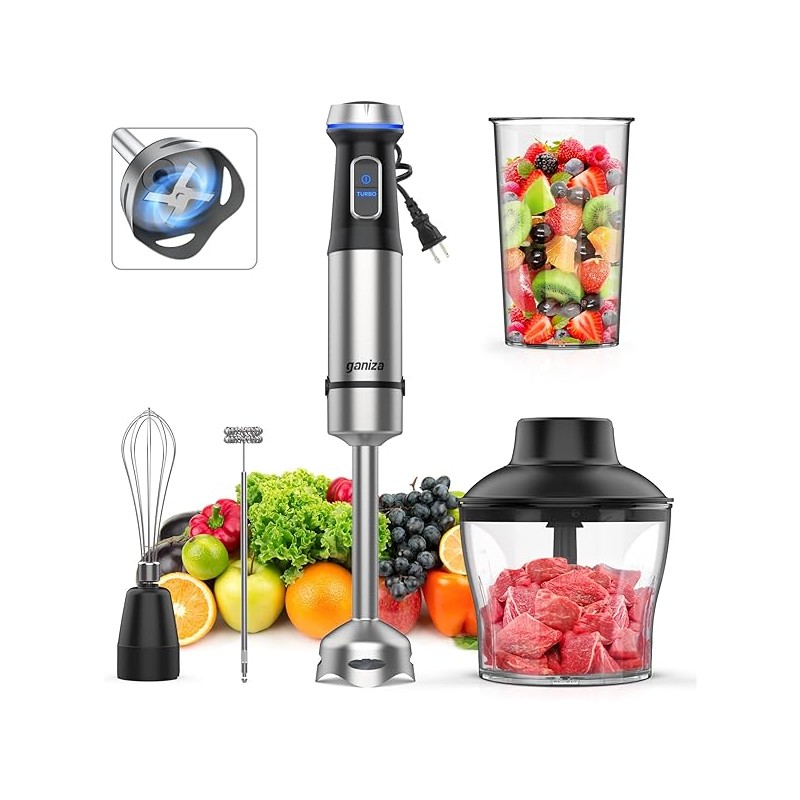 Ganiza Immersion Blender 5 in 1 Hand Blender Max 1000W Heavy Duty Motor, 16 Speed Mode Handheld Blender Stainless Steel Blade With 800ml Mixing Beaker, 600ml Chopper, Whisk and Milk Frother