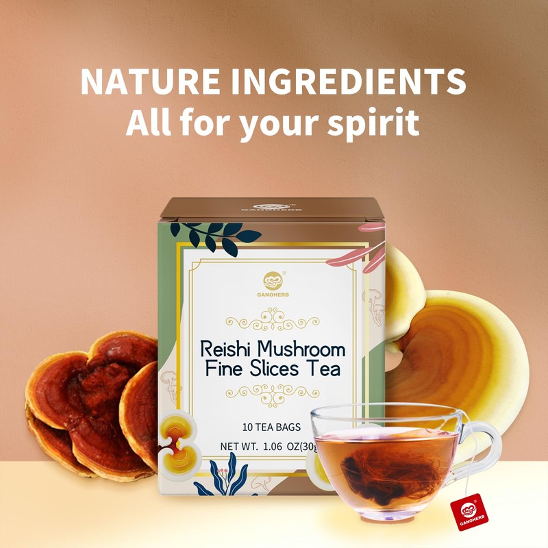 GANOHERB Reishi Mushroom Fine Slices Tea, 10 Bags, Adaptogen Ganoderma Lucidum Herbal Tea for Immune Health Boost, Stress Relief, Caffeine-Free, No Sugar, 1.06 OZ
