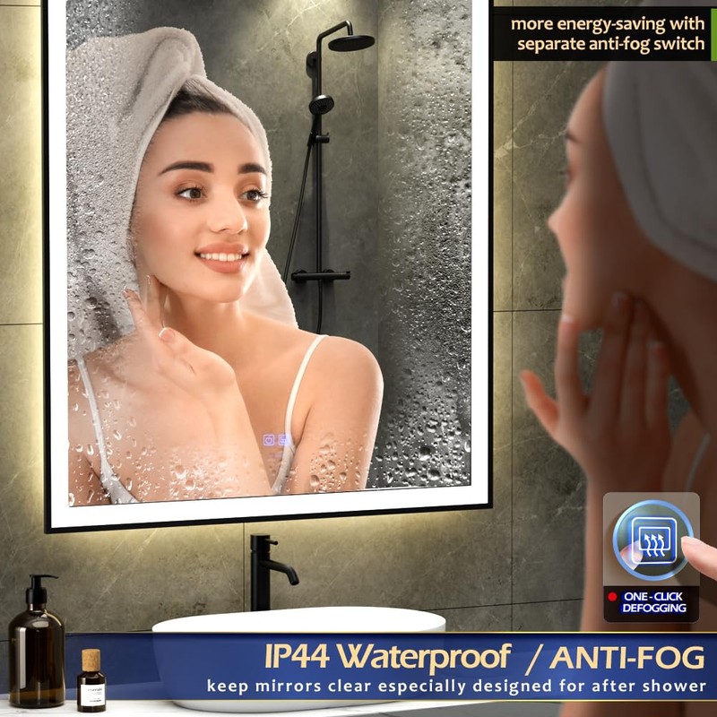 - [Anti-fog] The anti-fog function of the LED bathroom mirror operates with an intelligent temperature control sensor, which controls the heating temperature of the anti-fog film in accordance with the indoor temperature.
