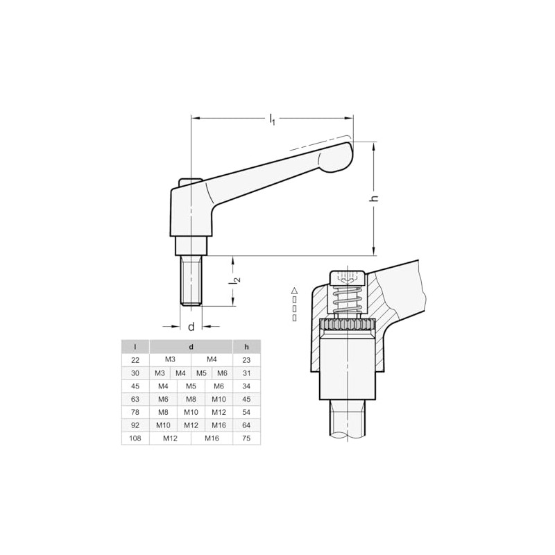 • Handle length: 78 mm; thread d: M12; thread length l2: 80 mm; height h: 54 mm