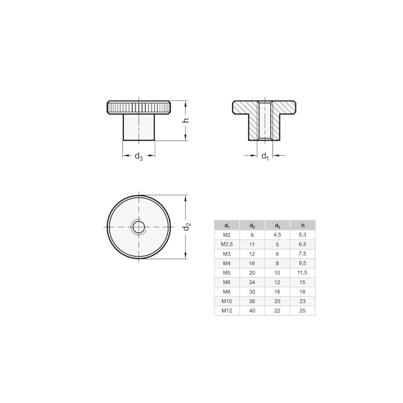 • Thread d1: M5; handle diameter d2: 20 mm; diameter d3: 10 mm; height h: 11.5 mm