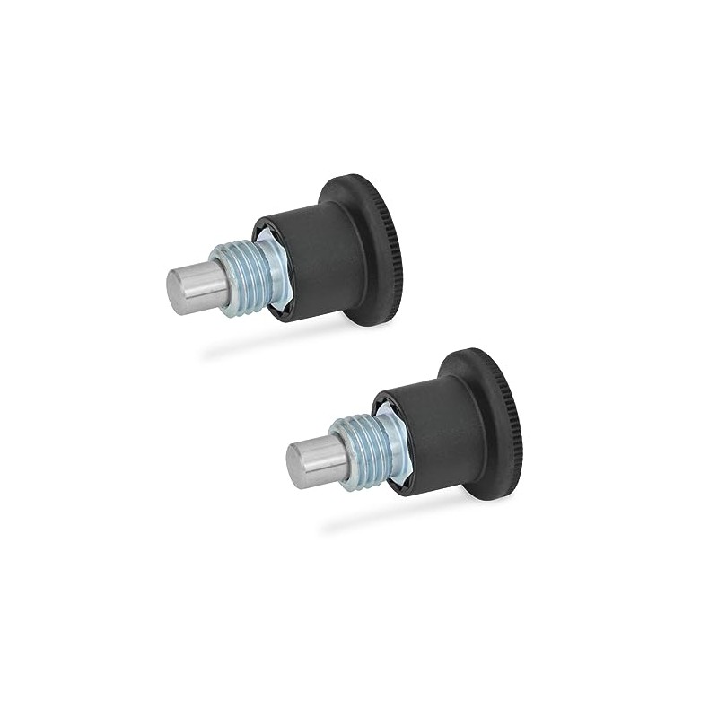 • Guide and locking pin: galvanised steel, blue passivated; pressure spring: stainless steel, 1.4310; button: plastic (polyamide), matte black, cannot be removed