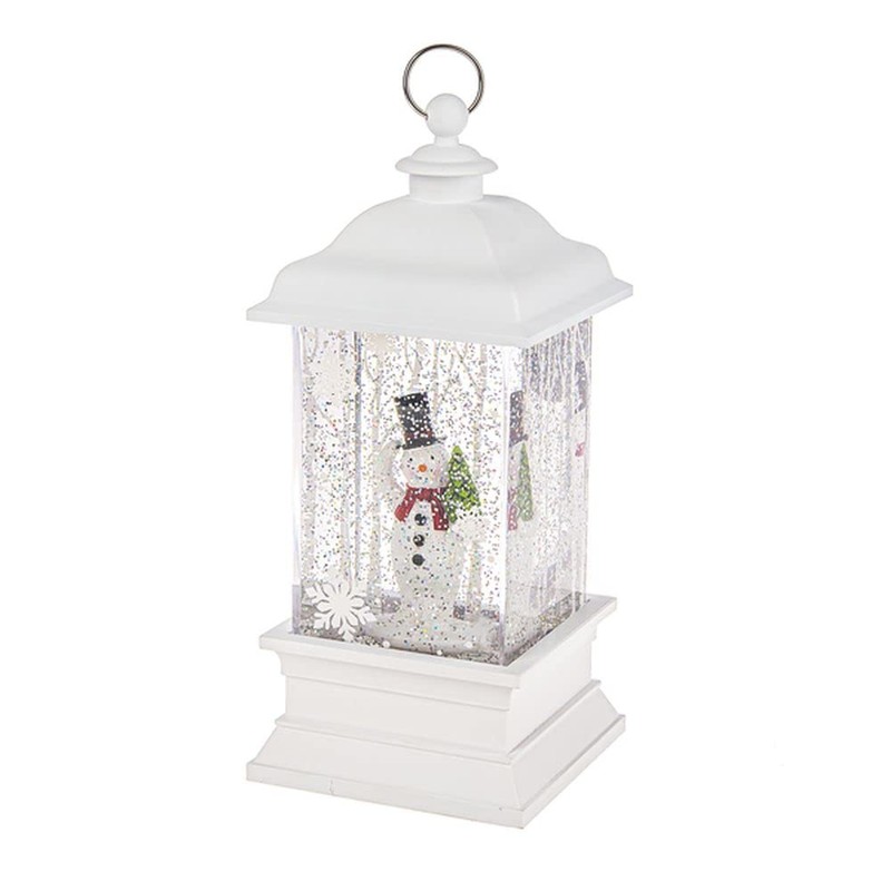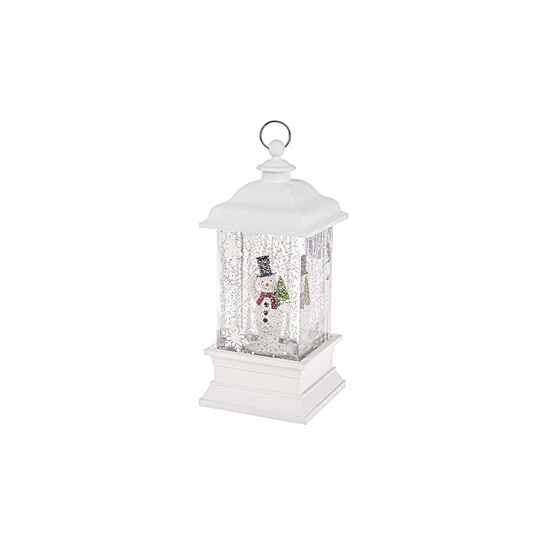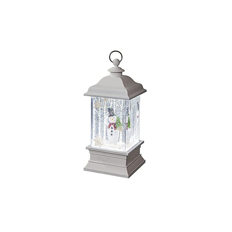 - Features a lantern water globe that has wonderful detail from every angle; Sleek greywash color with friendly snowman surrounded by glitzy glitter; Requires 3 AA batteries, Not included