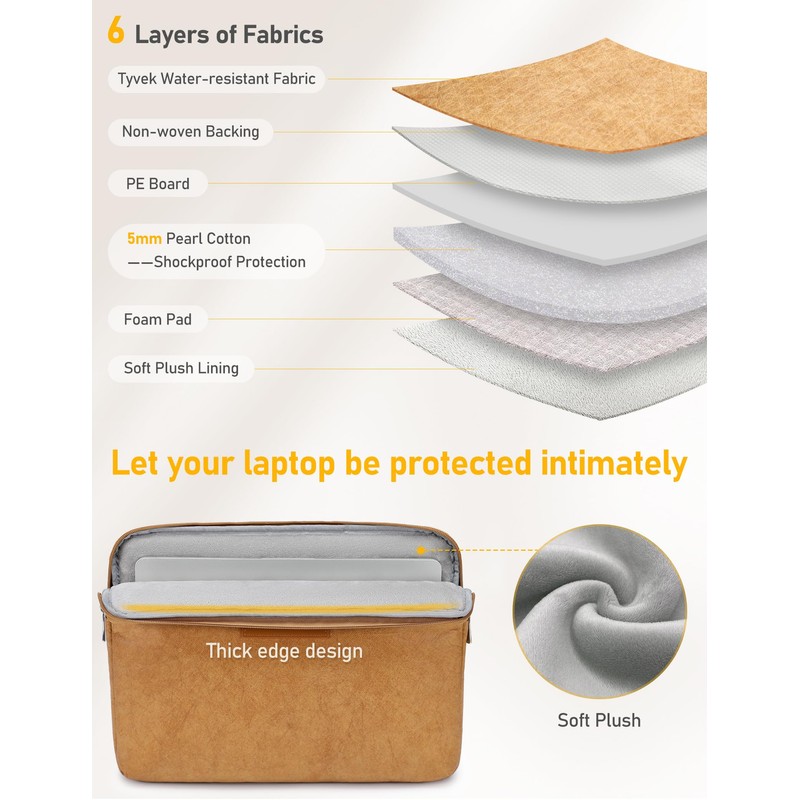 - Zero Pollution & Uniqueness: Tyvek is an innovative fabric that is durable, non-toxic, recyclable, and has zero environmental pollution burden. The natural texture of the fabric adds a unique look to each laptop bag