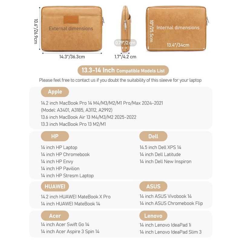 - Compatibility: The internal dimensions of the laptop bag is 13.4 x 10 x 1.3 inch. Compatible with 14.2 inch MacBook Pro 14 M4/M3/M2/M1 Pro/Max, 14.5" Dell XPS 14, 14" Dell Latitude 7490/9450, 14 inch HP Laptop/Chromebook/Pavilion x360/Stresm HD BrightView Laptop, 14 inch Acer Aspire 3 Spin/Swift Go, 14 inch ASUS Chromebook Flip CX1/Vivobook 14/Go 14/Zenbook 14 OLED/Zenbook DUO 2024, 14 inch Lenovo IdeaPad 1i/Slim 3, 14 inch Lenovo ThinkPad T480/T490