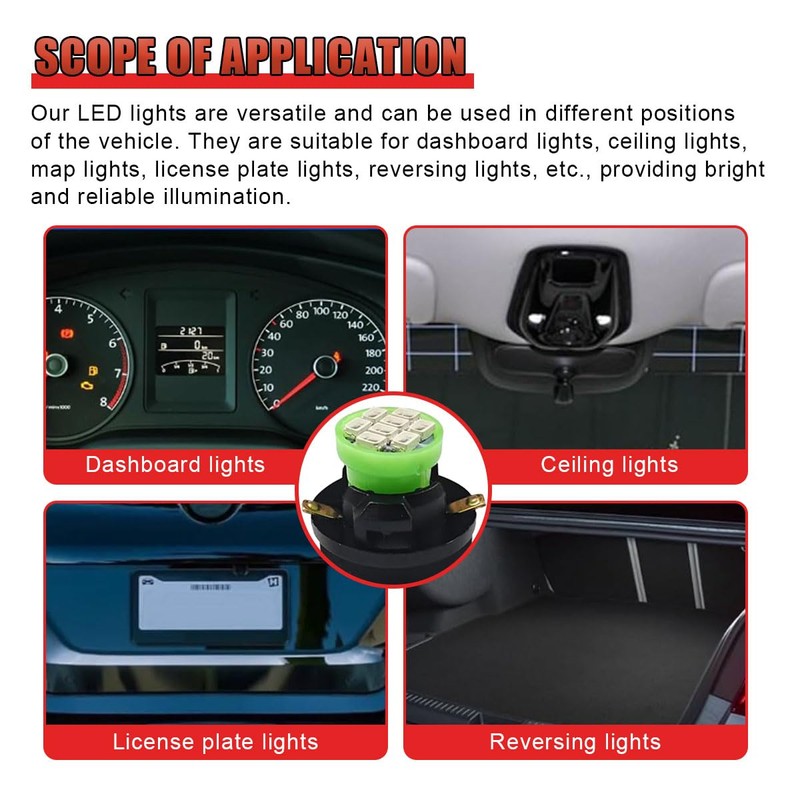 - 【Wide Application】: Transform your vehicle's lighting system with the multi-purpose LED bulbs. Perfect for dashboard applications, including speedometer, odometer, and tachometer illumination. Additionally, it is compatible with interior dome lights, map lights, trunk lighting, glove compartment lights, and license plate illumination. These versatile bulbs provide comprehensive coverage for all your automotive lighting needs, delivering consistent performance across various applications with uniform brightness and reliability.