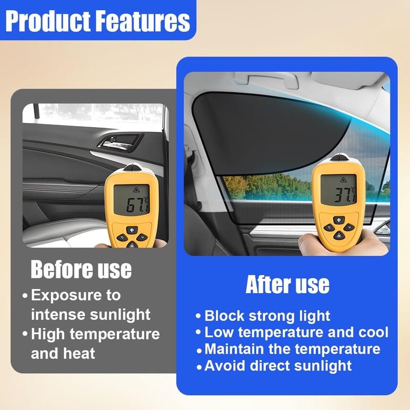 • 【Sunlight Blocking】: This car side window sunshade can effectively block most of the direct sunlight and UV rays, even in the hot summer, it can keep the car cool and comfortable for passengers. In addition, it can effectively slow down the aging and fading of the car interior.