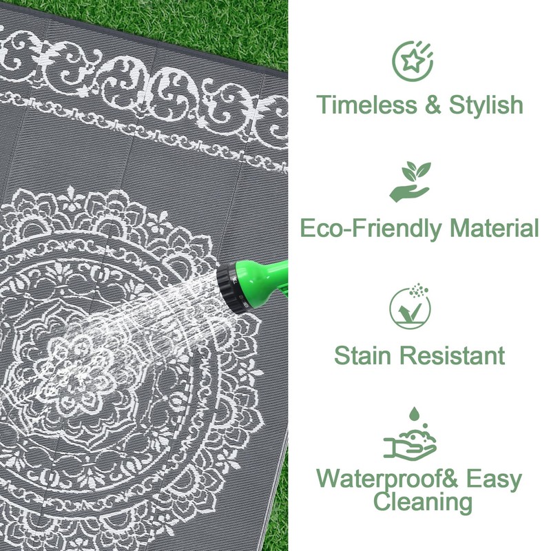- Stylish & Reversible Medallion Design: This waterproof outdoor rug features an elegant medallion floral pattern and is fully reversible, letting you instantly refresh your patio or camping space with two versatile looks in one