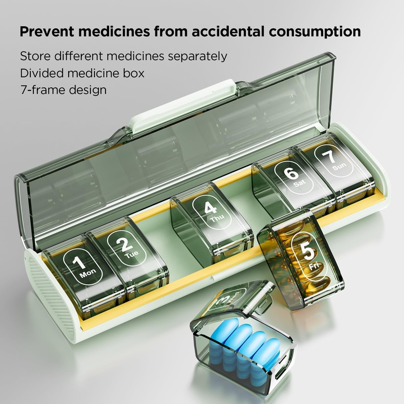 • 7 DAY PILL ORGANIZER: Weekly pill sorter helps you to easily plan and distribute your daily doses. Translucent lids for easy visual confirmation that you took your pill.