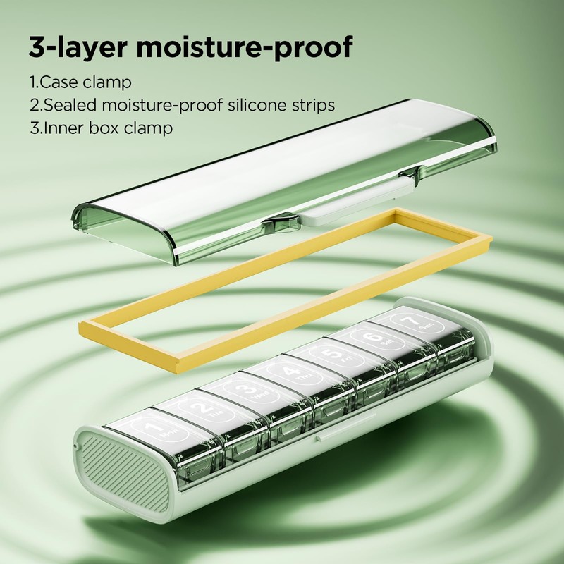• Moisture-Proof and Spill-Proof: This weekly pill holder adopts a triple protective mechanism. The silicone loop matching with the outer protective case can keep your pills from moisture. The snap-on lid keeps your pills secured, and each inner daily vitamin organizer lid closes tightly, so no more worries about unwanted spillage caused by the incidental touch of pets or kids.