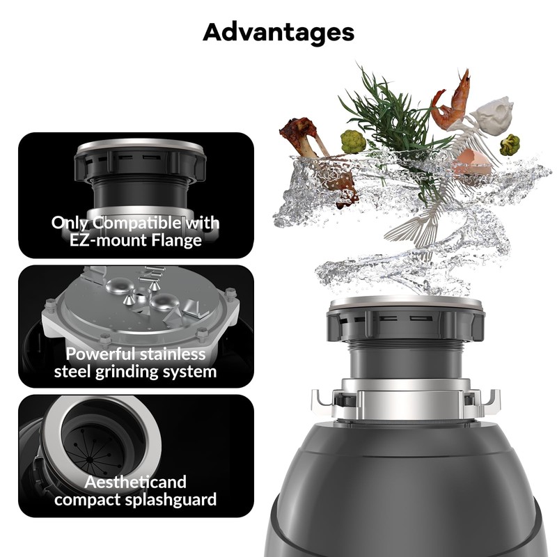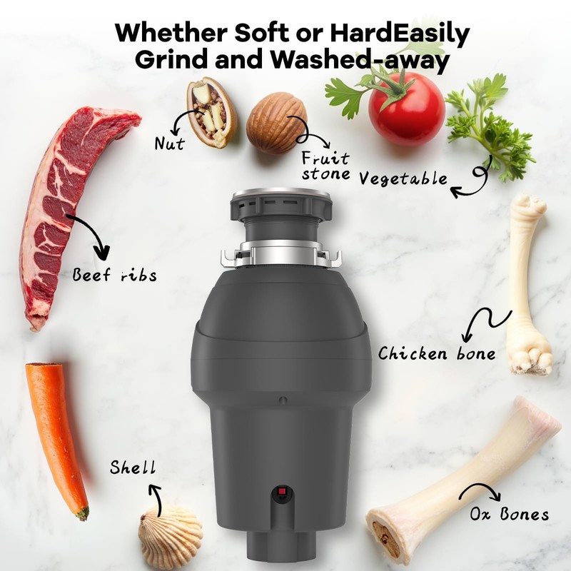 - STAINLESS STEEL GRINDING SYSTEM: Stainless steel grinding mechanism provides optimal torque to effortlessly slice through waste, while featuring a robust turntable equipped with balanced impellers that minimize vibration, ensure quieter performance, and extend the product's lifespan.