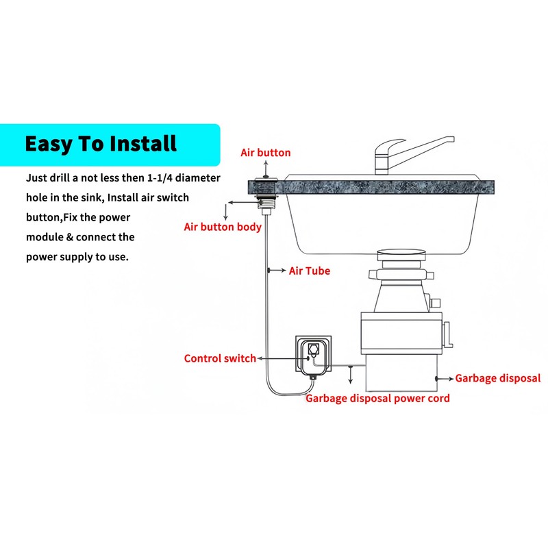 - 【Garbage Disposal Switch Kit】This kit contains stainless steel air switch button,Single outlet power module,Inner Diameter 3mm Air Tube.