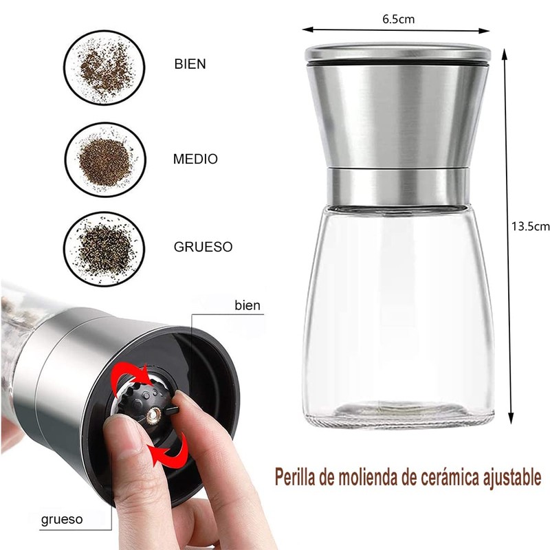 - 【Tapa de acero inoxidable y cuerpo de vidrio resistente】 Nuestro molinillo de sal y pimienta está hecho de acero inoxidable de alta calidad y una botella de vidrio sin BPA. El cuerpo de vidrio transparente lo ayuda a controlar la cantidad de especias restantes en cualquier momento y reponer rápidamente y sin desorden. Una adición moderna, elegante y agradable a su cocina. Ideal para comidas gourmet o cenas.