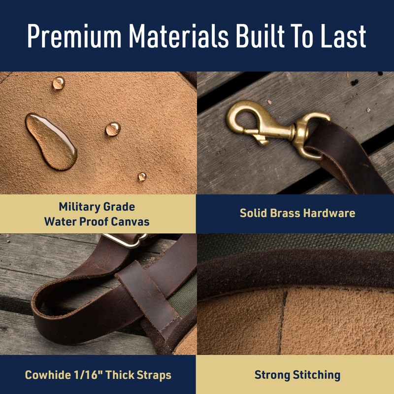 - PRODUCT DETAILS - Materials: Cowhide Suede and Duck Canvas. Dimensions: (L) 12” x (W) 24”; Canvas Tool Belt Fits Waists 35” - 48”. Color: Brown and Green.
