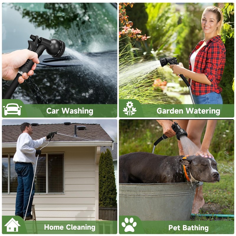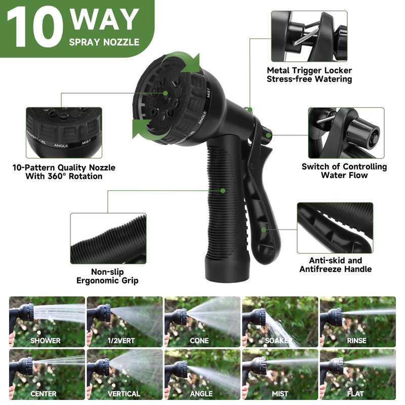 - 10 Functional Nozzle: The included nozzle with 10 different spray patterns is fantastic, covers all your watering and cleaning needs. From a gentle mist for delicate plants to a powerful jet for cleaning, this metal garden hose has you covered.