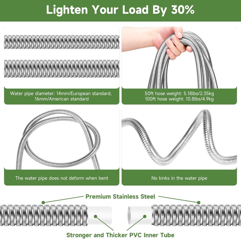 - Sturdy and Long- Lasting: The garden hose metal is made of sturdy 304 stainless steel. It offers premium durability and can endure pet bites, cacti puncture, dragging through dirt and rocks, and more. Not only can it be dragged on various materials of flooring for a long time without easily breaking, but it can also work normally in extreme weather.